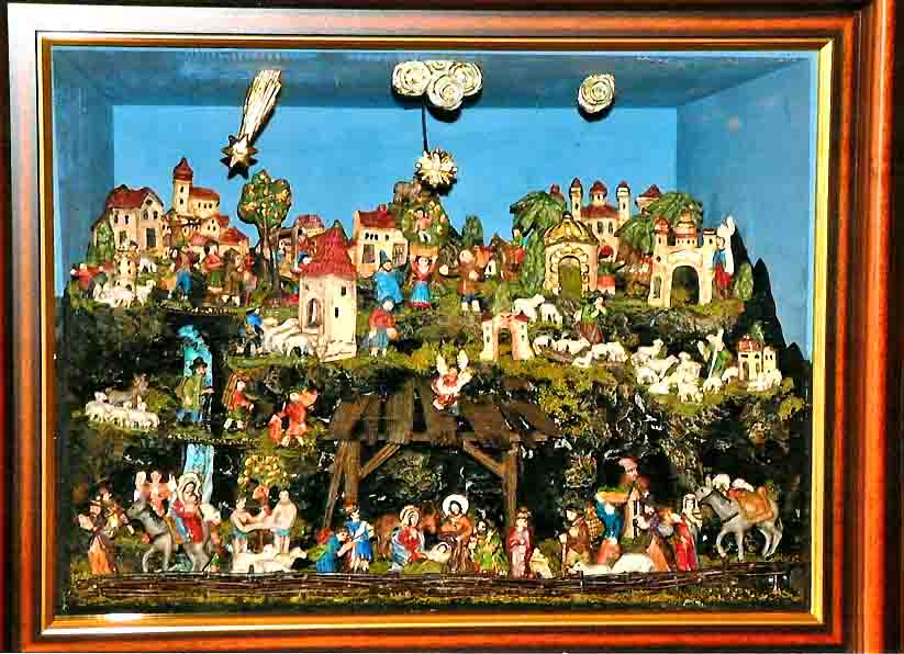 Der Aufbau dieser liebevoll gebauten Krippe beginnt mit dem steilen Gelände und einem oben liegenden Bergdörfchen. Im Krippenstall, der sich im Mittelteil befindet, stehen Maria und Josef mit dem Jesukindlein in ihrer Mitte. Im hinteren Stall stehen Ochs und Esel. Über der Höhle, schwebt ein handfester Gloriaengel. Den Abschluss der Krippe bildet der gemalte Hintergrund, der unser Alpenland zeigt. Mit dem Dreikönigsstern stehen die Sternsinger unterhalb des Stalles. Auf der linken Seite sieht man einen kleinen Bauernhof, hinter dem sich ein kleines Feld mit grasenden Kühen auftut. Vor dem Haus verjagt die Bäuerin einen bösen Wolf, der sich gerade eine Henne schnappt. Unterm Hof ziehen zwei Hirten mit ihren Schafen zum Stall und der Hl. Franziskus läuft hinterdrein um ja nichts zu versäumen. Ja, da ist ganz schön was los! Vorn spielen schon drei Musikanten auf und ein Paar'l tanzt schon. Einige Krippenmandl haben sogar Namen, damit man sie nicht übersehen kann. Die Landschaft dieser Krippe wurde nach alten Vorlagen gebaut und mit den liebevoll naiv geschnitzten Krippenfigürchen, die uns ein Bad Ischler Krippenfreund freundlicherweise schnitzte, bestückt. Eine liebenswerte Krippenmannschaft für unser himmlisches Jerusalem. Und keineswegs stören sie durch ihre anziehende Einfachheit unsere Krippengedanken. Ganz im Gegenteil! |