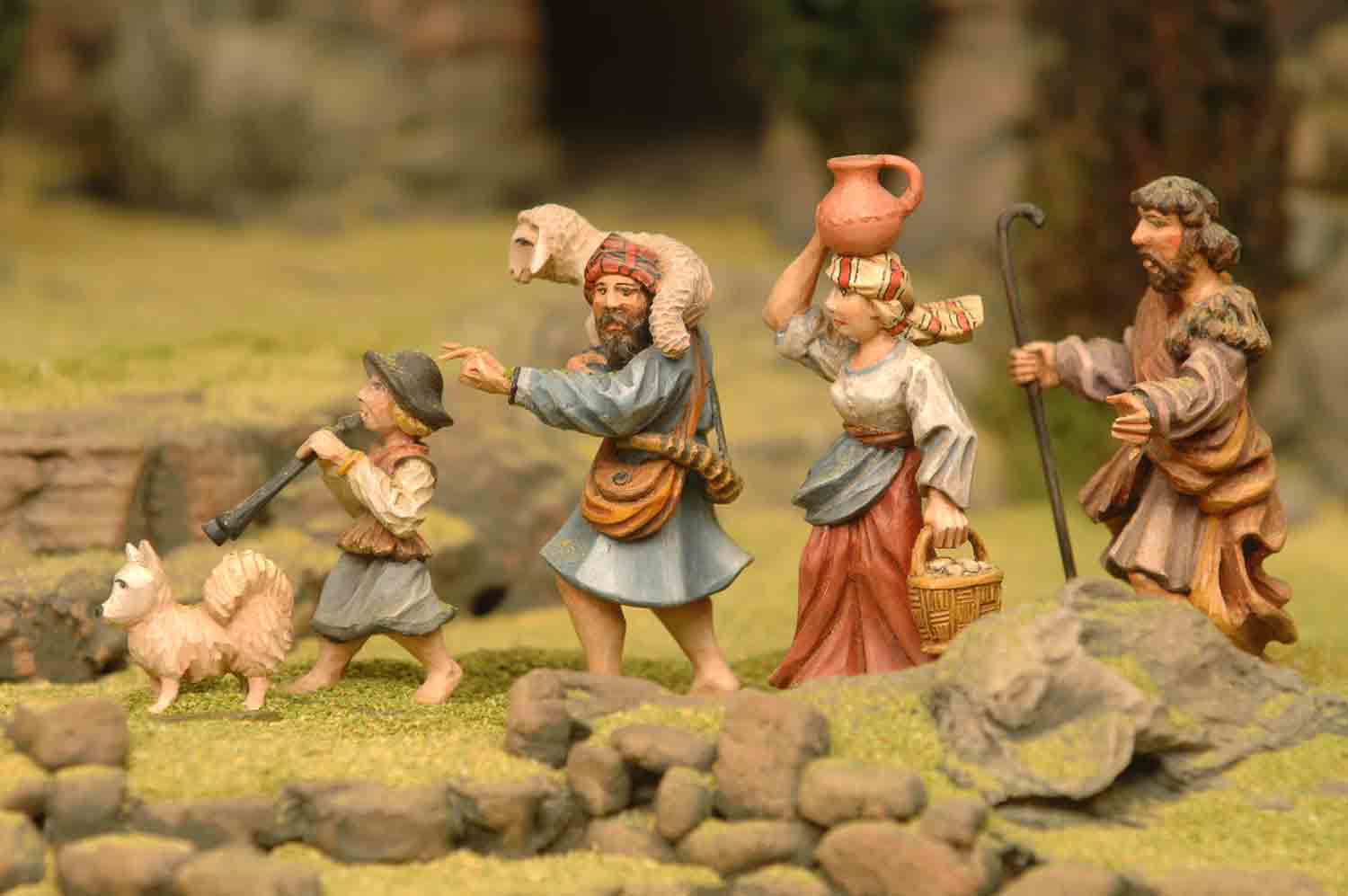 | Die Verkündigung an die Hirten geschieht mit der Geburt. Während im einfachen Stall zu Bethlehem Jesus in der Krippe zur Welt kam, öffnete sich der Himmel über den bescheidensten Menschen, den Hirten auf dem Felde. Ein Engel stieg zu ihnen herab. Dieses Hirtenfeld bei Shahour liegt eine halbe Gehstunde, bergab von Bethlehem. Dort soll schon David, der Sohn Jesajas seine Schafherden gehütet haben. In unseren Krippen bildete das Hirtenfeld einen Teil der Landschaft. Der Davidsbrunnen auf dem Hirtenfeld erinnert bis heute noch an damals und ist in mancher Krippe zu sehen. Die Hirten eilten - wie die Bibel berichtet - vom Verkündigungsengel Gabriel zum Stall und waren mit ihren bescheidenen Geschenken die ersten bei der Krippe. Sie waren die ersten Gabenbringer. Für mich ist diese Aufstellung die „Schönste“. Sie strahlt Ruhe und Demut aus. |