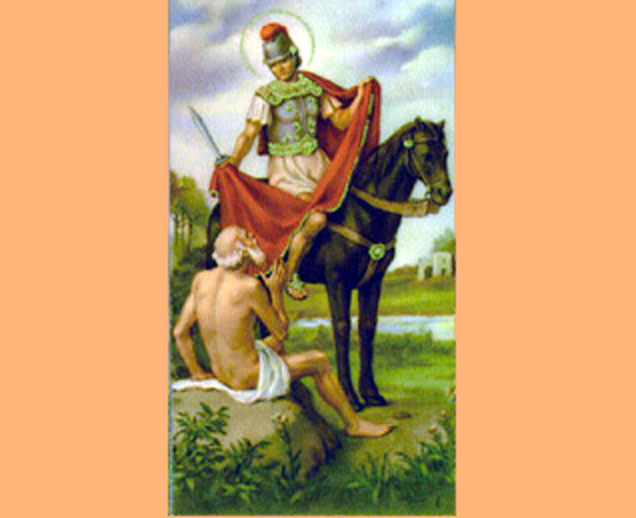 Martini am 11. November Zur Zeit des heiligen Martin galt ein kaiserliches Edikt, wonach die Söhne von Berufssoldaten zum Kriegsdienst gezogen wurden. Dadurch wurde auch Martin, gegen seinen Willen, mit 15 Jahren zum Militärdienst eingezogen. Noch war Martin nicht getauft; aber in allem verhielt er sich nicht, wie sich sonst Soldaten verhielten: Er war gütig zu seinen Kameraden, wunderbar war seine Nächstenliebe. Seine Geduld und Bescheidenheit überstiegen die der anderen bei weitem. Seine Kameraden verehrten ihn und hielten ihn schon damals mehr für einen Mönch als einen Soldaten. Denn, obwohl noch nicht getauft, zeigte er ein Verhalten wie ein Christ: Er stand den Kranken bei, unterstützte die Armen, nährte Hungernde, kleidete Nackte. Von seinem Sold behielt er nur das für sich, was er für das tägliche Leben benötigte. |