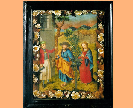 Das Frauen- Josefs- oder Bildertragen zählt in unserem Land, vor allem in der Tiroler und Salzburger Gegend zu einem alten vorweihnachtlichen Brauch. Er dürfte schon im Zuge der Gegenreformation entstanden sein und erinnert an die Herbergsuche der Hl. Familie. Über diesen Brauch sollte ursprünglich in entlegenen Gebieten das kirchlich, religiöse Gemeinschaftsleben gefördert werden. Und so wurde das Fraubildnis unter Nachbarn weitergereicht und die Familien verbrachten gemeinsam einen Abend im Gebet. Man versuchte außerdem bei dieser Gelegenheit eventuelle nachbarliche Zwistigkeiten auszuräumen, um bei adventlichen Zusammenkünften einander friedlich begegnen zu können. Früher wurde die Tafel mit der Herbergsuche von ärmeren Leuten von Haus zu Haus getragen und dafür mit kleinen Gaben, meist mit hausgemachten Lebensmitteln beschenkt. Zu unserer Kindheit war es noch ein besonderes Ereignis, wenn „Frauträger“ ins Haus kamen und für die Heilige Familie um eine „Herberg“ baten. Die Familie und alle Hausbewohner versammelten sich dann zum gemeinsamen Gebet. Gebete wie „Der Engel des Herrn“, der Rosenkranz oder einige „Vater unser“ wurden zur Ankunft und am nächsten Abend zur Verabschiedung der Hl. Familie gebetet. Heute noch wird in manchen Gegenden in der Adventzeit das Bildnis mit der Herbergsuche im Bekannten und Verwandtenkreis weitergereicht und damit der uralte Brauch des „Frauentragens“ hochgehalten. Bild : Fraubild aus Kuchl, bemalte Holztafel mit Trockenblumen in verglastem Rahmen ca. Mitte 18.Jh. |