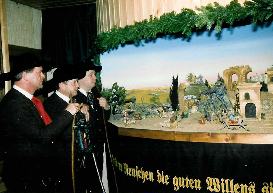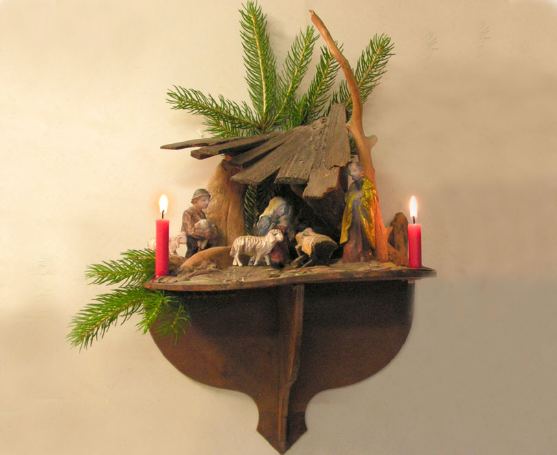 „Die Krippe soll wenigstens so groß sein, mahnte bei einer Krippenversammlung im Jahre 1911 ein „uriger“ Krippeler, dass man den Platzmangel in der Stube spürt. Man habe, meinte er weiters, auch noch nie gehört, dass einem Vogelliebhaber der Platz für die Vogelsteigen gereut habe. Um so weniger soll uns der Platz gereuen für die Weihnachtskrippe Wenn man eine der vielen Krippenausstellungen besucht, die jährlich von Krippenvereinen in unserem Land zur Weihnachtseinstimmung aufgestellt werden, freut man sich am regen Interesse der Besucher und ihrer Liebe zur Weihnachtskrippe. Leider hört man aber manchmal die Worte: „Ja, so eine Krippe wäre schon schön, wenn wir eine hätten, aber wohin damit...?!“ Also kein Platz! Wohl sind heute bei diesen beschränkten Wohnverhältnissen wenig Krippenfreunde in der Lage sich eine Großkrippe anzuschaffen. Aber trotzdem möchte ich gerade diesen Krippenfreunden ans Herz legen, nicht auf die Größe kommt es an, denn „Wo ein Wille ist, ist auch ein Weg“! Die Weihnachtskrippe wird in der Adventzeit aufgestellt. Der schönste Platz ist für eine kleinere Krippe zweifellos unter dem Christbaum oder dem Herrgottswinkel. Sie wird meist erst am heiligen Abend mit dem Weihnachtsbaum aufgestellt, und bleibt bis nach dem Dreikönigstag, solange der Christbaum in der Stube aufgerichtet ist. Meist wurden diese kleineren Krippen in der Schule oder in einem Baukurs nach dem Leitspruch „In jede Familie eine Krippe“ gebaut. Sie sind häufig nur mit einfachen Figuren, der Geburtsgruppe und den Drei Königen für den 6.Jänner bestückt. Selten sieht man auf diesen Krippen geschnitzte Figuren von Künstlerhand. Vielfach sind sie aus Papiermaschee oder Plastik angefertigt. In der neueren Zeit allerdings, wurden maschinengefräste Holzfiguren der billigeren Plastikfigur - zur allgemeinen Freude - immer mehr bevorzugt. |