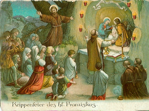 | Im Jahre 1223 hielt sich Franziskus in Rom auf. Es reifte in ihm der Entschluß, in diesem Jahre Weihnachten besonders zu feiern. Er besprach sich hierüber mit dem Papste und schrieb dann seinen Plan seinem Freund Johannes Valita in Greccio. Der sollte die Feier vorbereiten. Im Wald bei Greccio wurde eine Krippe errichtet und darein das göttliche Kind auf Stroh gelegt. ein Ochs und ein Esel standen dabei; sie sollten das Kindlein mit ihrem Hauche erwärmen. Als Franziskus kam, fand er alles vorbereitet. Scharenweise strömte das Volk zusammen, auch die minderen Brüder der benachbarten Klöster kamen. Der Wald hallte wider von Lobgesängen und lodernde Fakeln erhellten die Nacht. Franziskus kniete mit tränennassen Augen und betend vor der Krippe. Um Mitternacht wurde die Hl. Messe gefeiert und Franziskus sang als Diakon das Evangelium. Hierauf bestieg er eine eigens aufgestellte Kanzel und predigte über die Geburt des Herrn mit solcher kraft, dass das gläubige Volk tief gerührt war. Später wurde zu Greccio zum Andenken an diese Krippenfeier eine Hl. Kapelle erbaut. geschrieben Provinzial P. Franz Seraph 1918 |